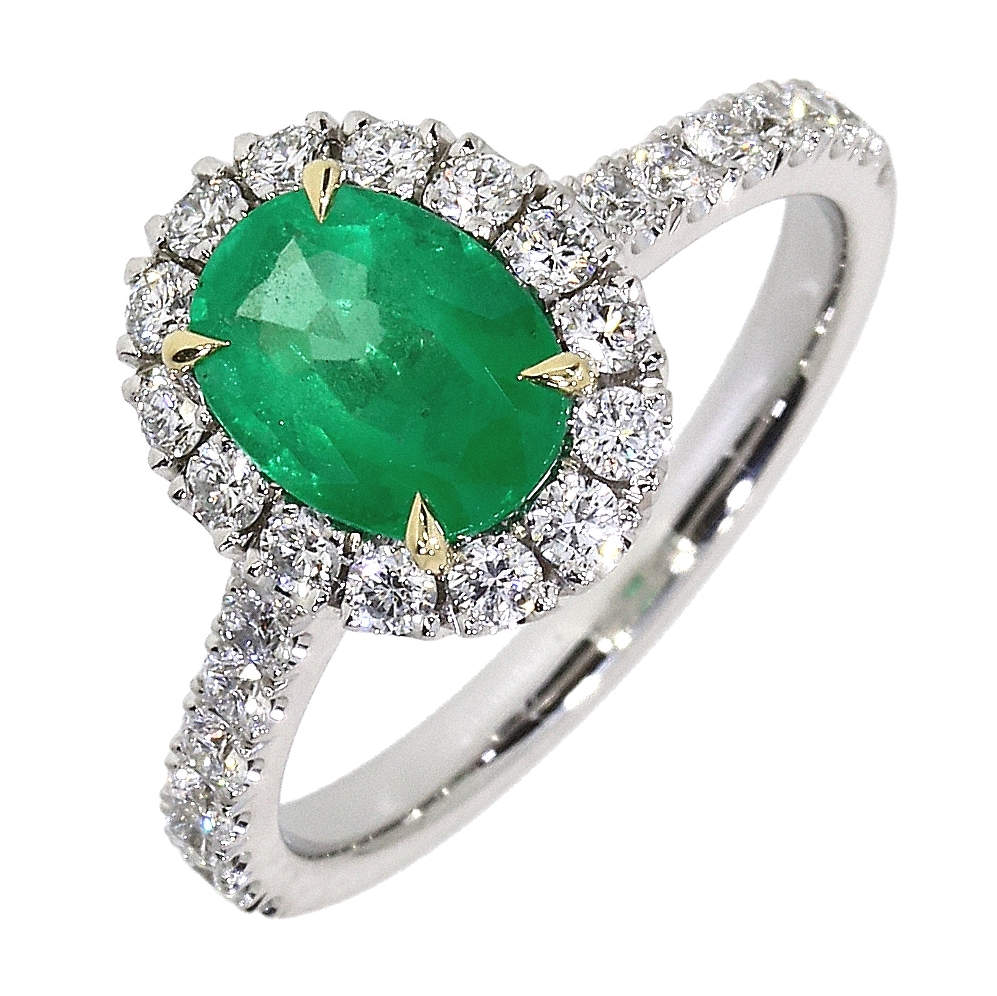 Platinum Emerald and Diamond Set Oval Cluster Ring. Comprising of an Oval Emerald weighing 1.18ct and secured by four talon claws. A further 0.69ct of round brilliant cut diamonds in halo and shoulders of ring.