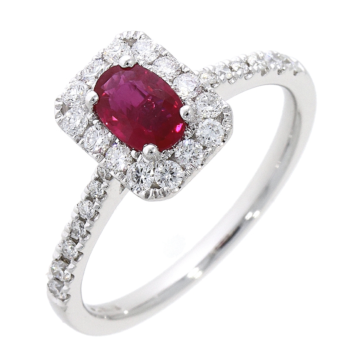 18ct white gold, ruby and diamond cluster ring. Comprising of an oval ruby, size 0.55ct and four claw set. With a surround of fourteen diamonds, claw set with a rectangular mount. A further seven diamonds are set in each tapered shoulder. Total size 0.37ct.