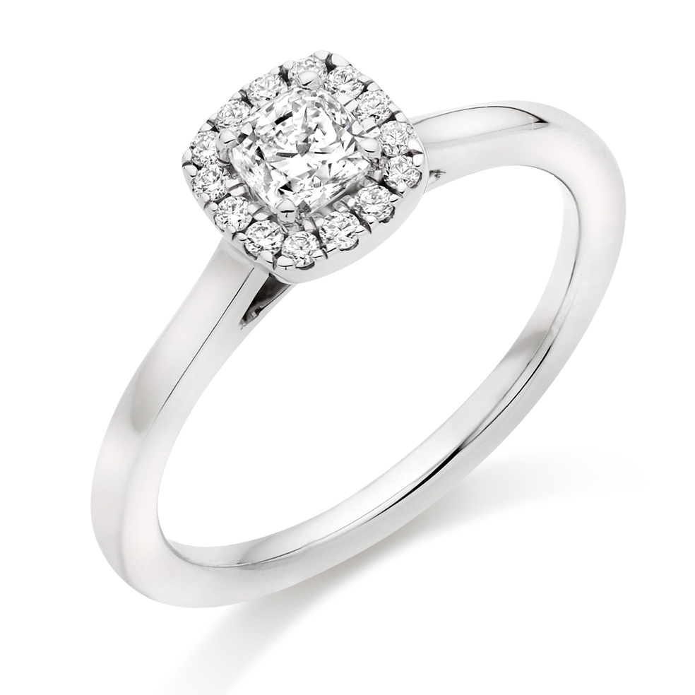 Comprising of a cushion cut diamond, 0.33ct, E,VVS2, with a certificate.