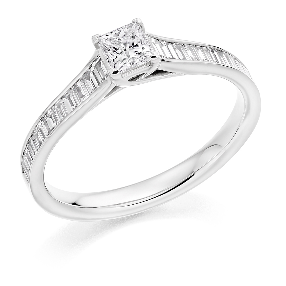 Platinum princess cut diamond ring with baguette set shoulders.