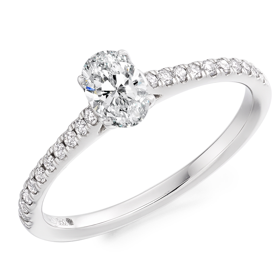 Platinum oval 0.50ct single stone engagement ring with diamond set shoulders.